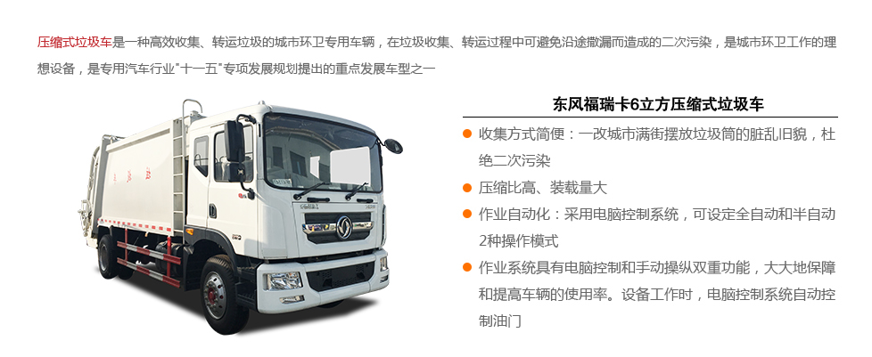 標準: 壓縮式垃圾車:采用機、電、液聯(lián)動控制系統(tǒng)、電腦控制及手動操作系統(tǒng),通過填裝器和推鏟等裝置實現(xiàn)垃圾倒入、壓碎或壓扁,并將垃圾擠入車廂并壓實和推卸。
